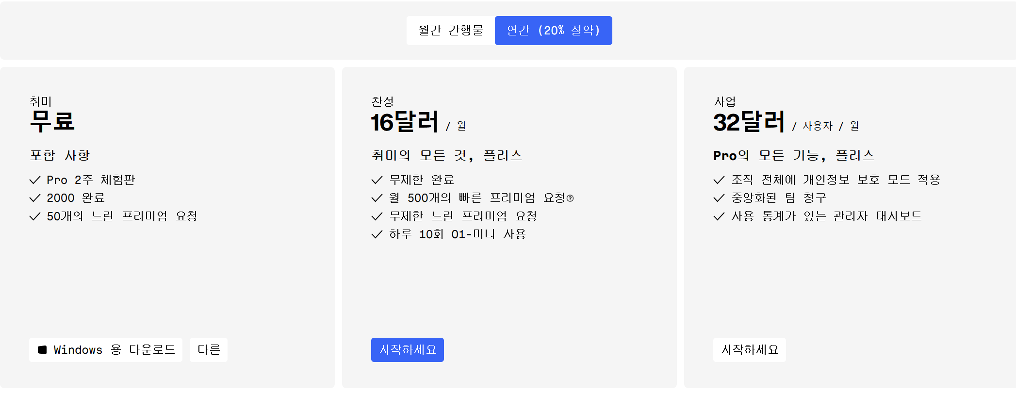 - Business 플랜: 팀 사용자를 위한 플랜으로, 월 $40/유저로 제공됩니다. 이 플랜에서는 코드의 프라이버시 모드를 강화하여 팀의 보안 관리를 지원합니다. SOC 2 인증을 통해 사용자 데이터 보호 및 기밀 유지에 집중하며, 관리 대시보드와 중앙화된 팀 청구 기능도 제공됩니다 .